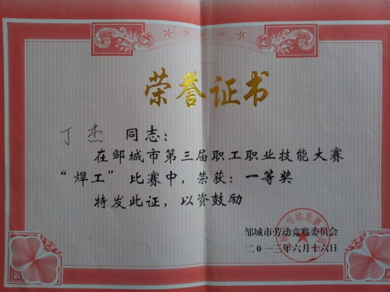 2013年6月在“鄒城市第三屆職工職業(yè)技能大賽”中獲得電焊工第一名的優(yōu)異成績;