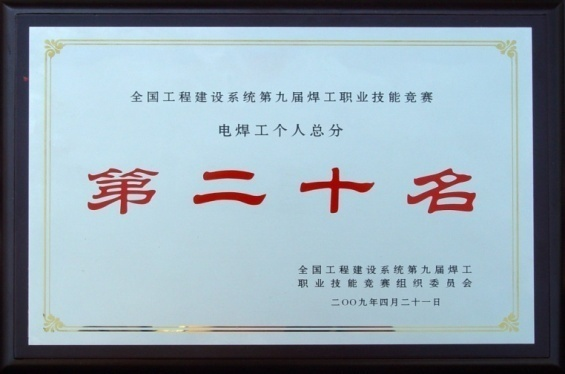 濟(jì)寧市首席技師   2009年在“全國工程建設(shè)系統(tǒng)第九屆焊工職業(yè)技能競賽”中獲得了電焊工個人總分第十九名的優(yōu)異成績;
